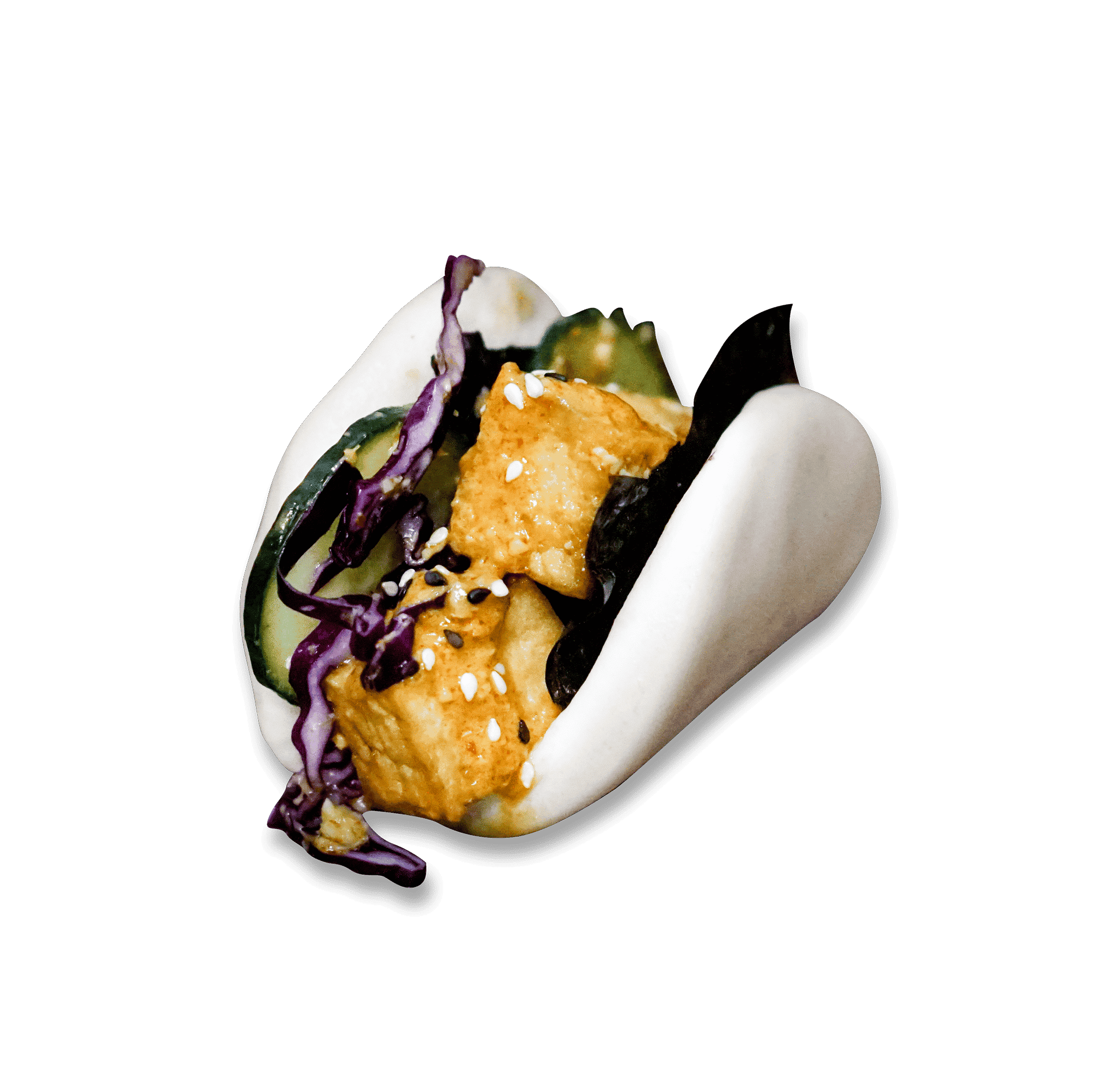 Pan-seared organic tofu with house made cashew satay, cucumber, house made slaw and nori, in a warm fluffy bun
