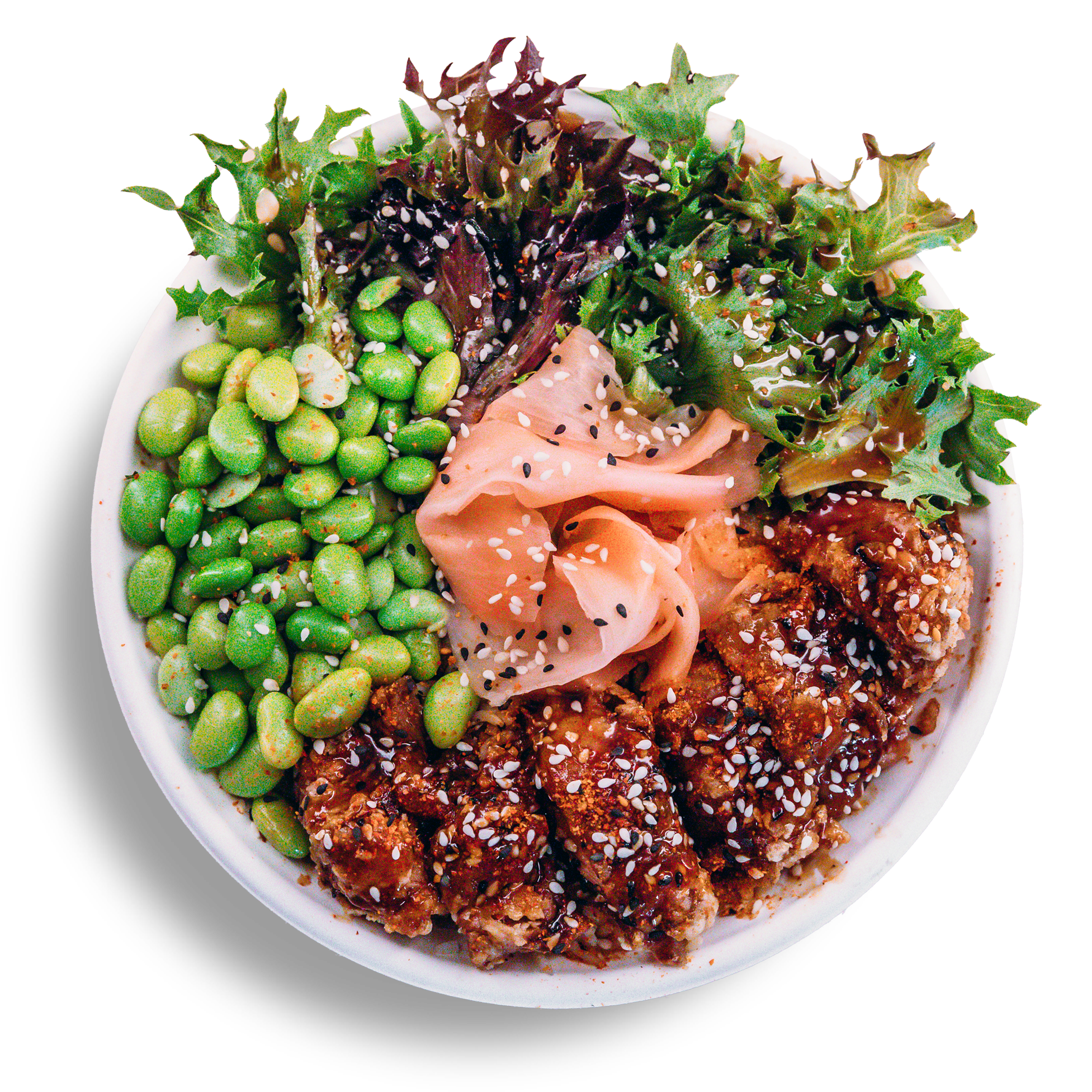 48-hour marinated chicken lightly fried to crispy tender perfection, atop fluffy jasmine rice, edamame and drizzled in our housemade teriyaki sauce with a dollop of spicy mayo