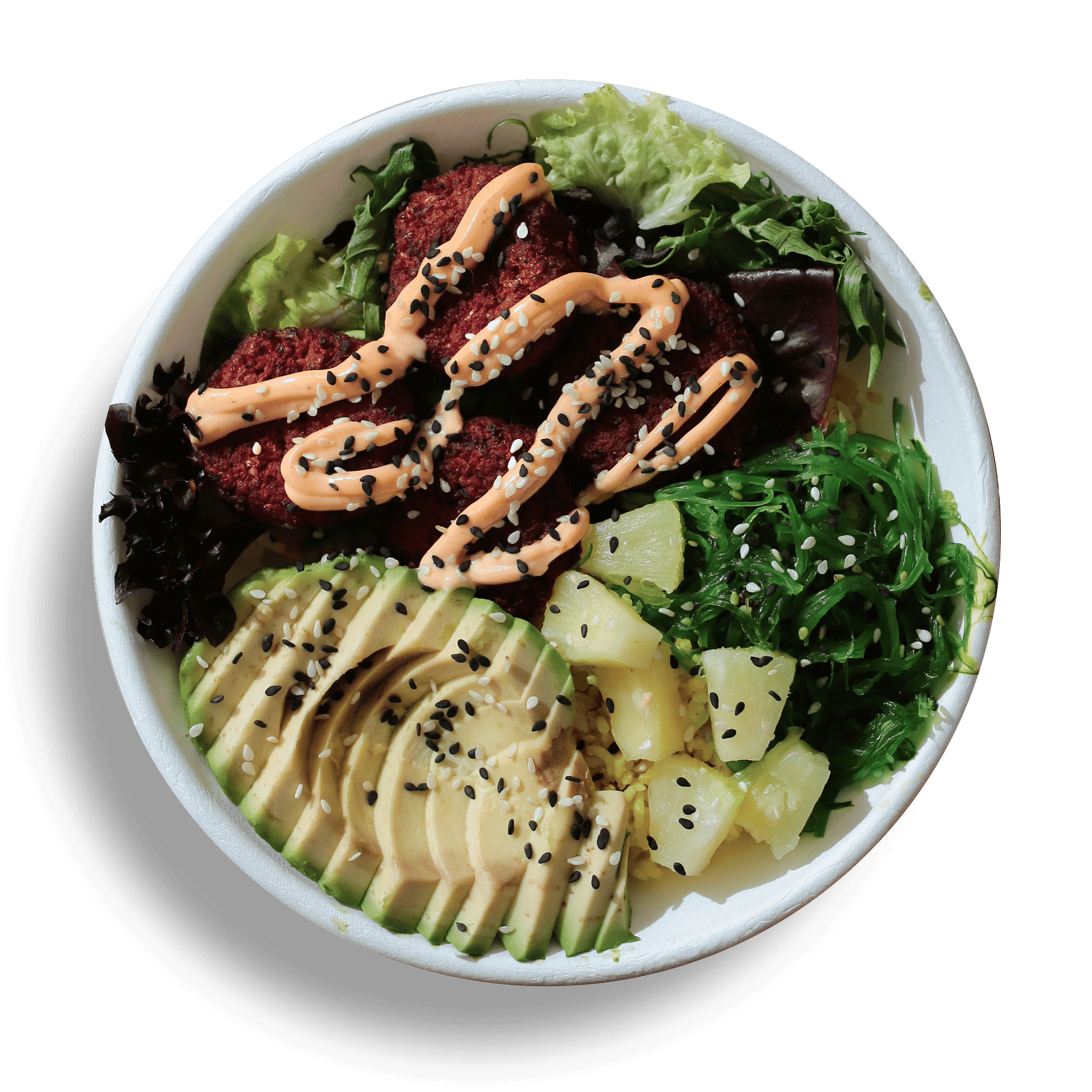 Miso Falalalafel >> Yellow Rice > Mixed leaves only > Falafels > Spicy Mayo > Seaweed Salad > Pineapple > Avocado